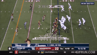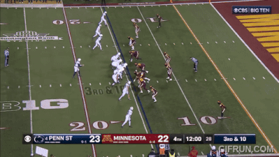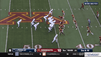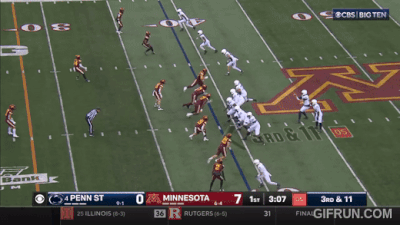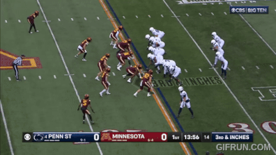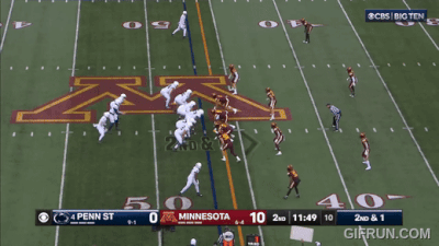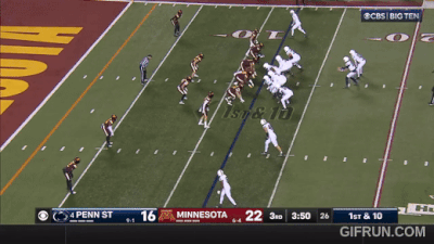 Above– TOSS! Another defense that can’t get to the perimeter? Great blocking from PSU on the outside and Minny’s defenders block themselves for the 1st down. Zero block destruction for the Gophers.
