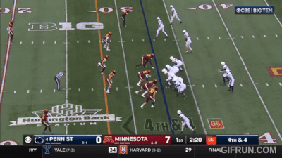 Above– On a tough 3rd and inches against that look the Gophers stop PSU’s defense. This is how you hold a team to under 10% on 3rd down with solid fits, block destruction and finishing the tackle.