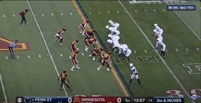 Above– PSU lines up in 22 personnel (two backs, two tight ends) and Minny works into a five man front with three linebackers in the box.