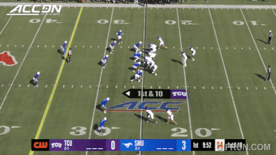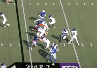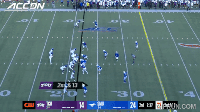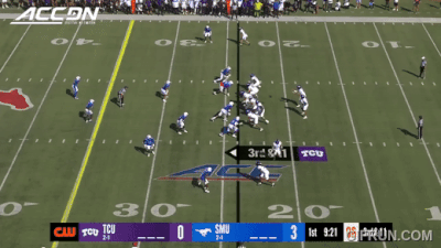 Above– TCU creates a nice pocket when the LG recovers that block. Brockermeyer helps the RG and one thing I’ve noticed is that he does shoulder turn on his combos in pass pro which IMO can create a lane for delayed blitzes or twists.