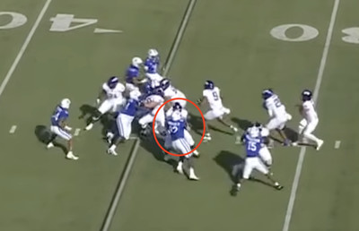 Above– This might be the worst rep of the game. Misses on the 1st level and then his 2nd level block helps make the play. No one moves when he puts his hands on them and they can all maintain the leverage against him and rip off in the run game.