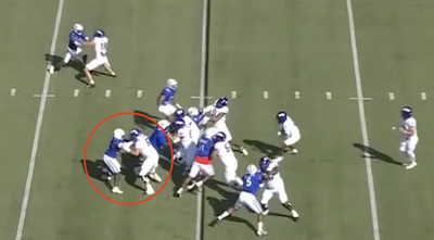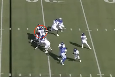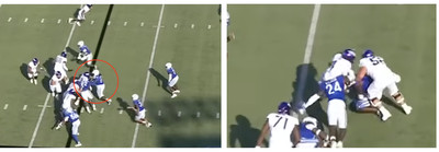 Above– You can watch it play out here. I have no idea why he comes off that block and if the DT doesn’t completely whiff his finish it’s a TFL.