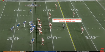 Above– Eight of 11 defenders are lined up weak-A over to the field. That leaves three (and one is 15y off the ball) to the weak side after one down block.