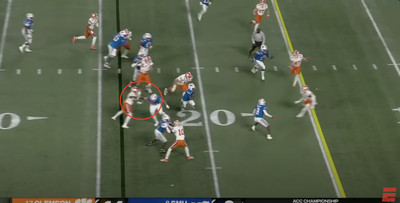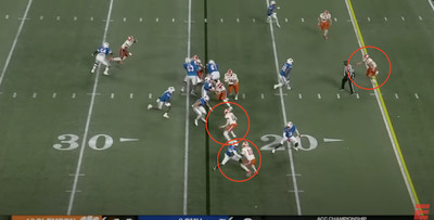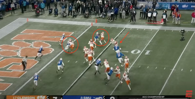 Above– The downfield blocking for SMU is 100%. A nice chest shove opens this up for a TD.