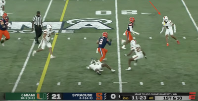 Syracuse took the slight edge on money downs, turned their turnover in a touchdown on the fumble recovery scoop n’ score, and had 54 less penalty yards in flags. After starting down 21-0, you have to respect Brown for keeping his players engaged and ready to come back aginst the ‘Canes.